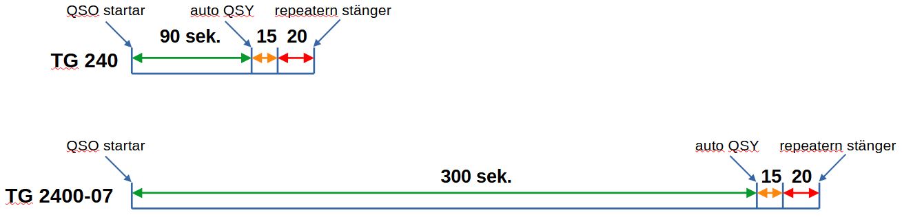 | Repeater-nätet SvxLink är baserat på talgrupper och har en funktion som kallas ”auto QSY”. Auto QSY innebär att vissa talgrupper har en tidsbegränsning. När denna tid löpt ut tilldelas samtliga repeatrar som deltar i QSOt en så kallad ”dynamisk talgrupp”. Syftet är att inte blockera onödigt många repeatrar i nätet. Dynamiska talgrupper ligger inom spannet 2409900 – 2409999. Om man inte deltar aktivt i QSOt men ändå vill fortsätta lyssna efter att repeatern annonserat ”QSY väntade” räcker det med ett kort tryck på PTTn för att repeatern skall ”följa med” i QSYt. QSY timeout är 15 sekunder. Talgrupper med tidsbegränsning illustreras nedan. |